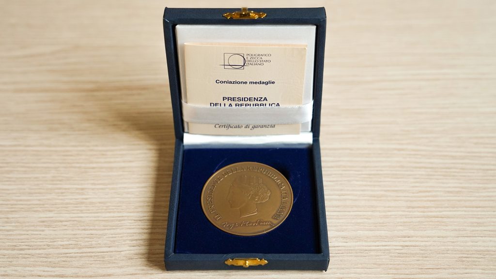 La medaglia, coniata in bronzo dall’Istituto Poligrafico e Zecca dello Stato, raffigura sul dritto l’Italia Turrita, tratta da un’antica moneta siracusana di epoca romana ispirata all’opera del disegnatore Vittorio Grassi. Intorno riporta la scritta “Il Presidente della Repubblica Italiana” e in basso la firma in rilievo del Presidente della Repubblica in carica, Sergio Mattarella. Sul verso, invece, è rappresentata l’iconica torretta della Palazzina Gregoriana del Palazzo del Quirinale, sede della Presidenza della Repubblica.